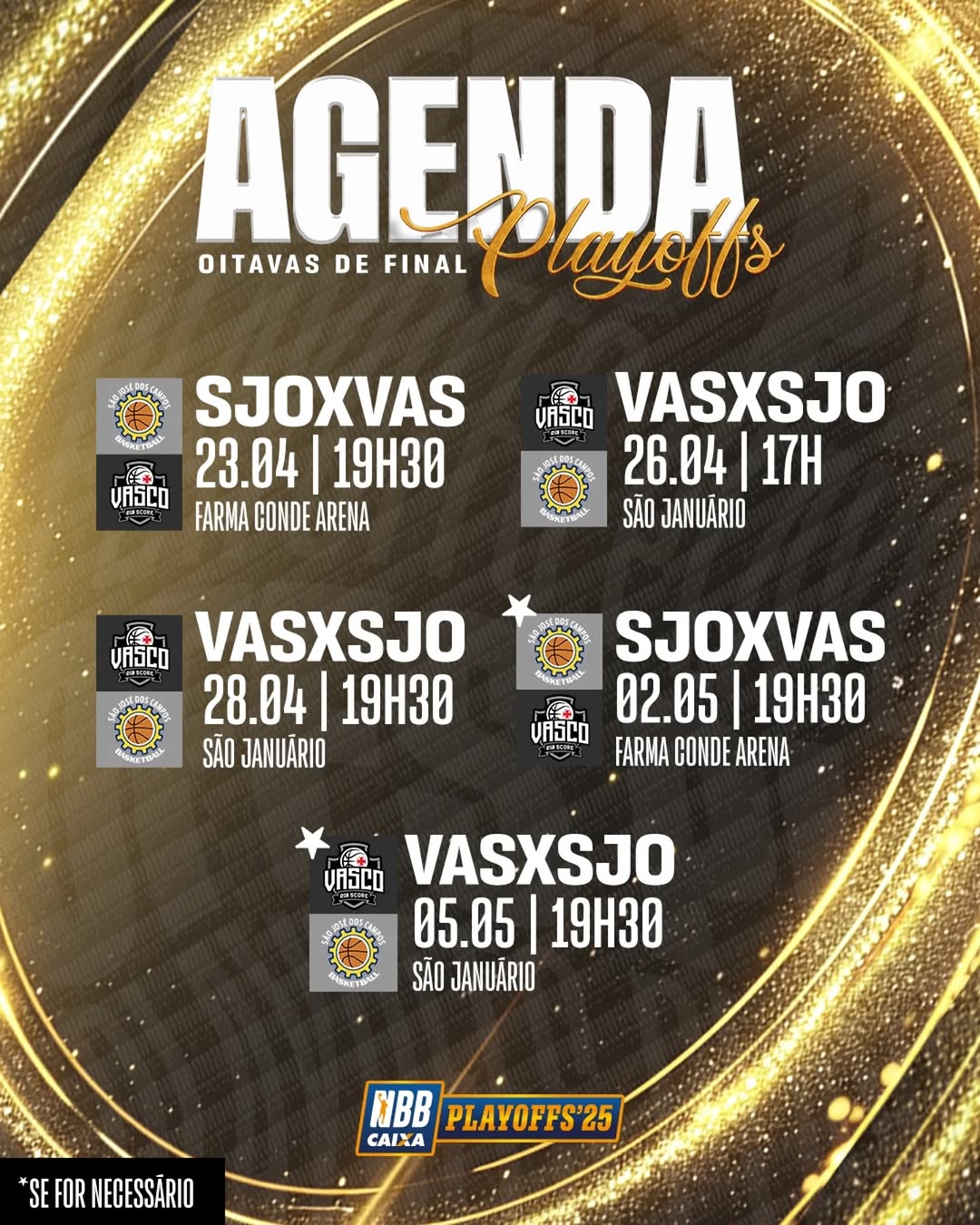 As oitavas de final dos playoffs do NBB CAIXA para o R10 Score Vasco estão chegando, e o #GiganteDoBasquete já sabe o caminho: nosso adversário será o São José! A primeira batalha será fora de casa, em São José dos Campos, e contamos com a presença da torcida vascaína da região para dar aquele APOIO que só a MAIS LEAL sabe oferecer. Na quarta-feira, 23, às 19h30.