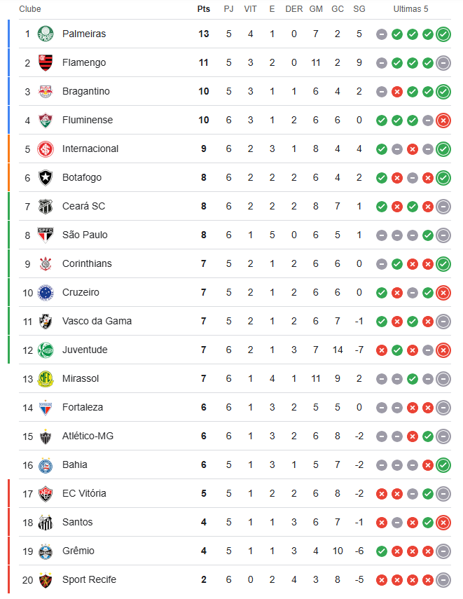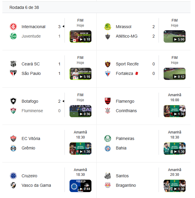 Terminados os jogos deste sábado da 6ª rodada do Campeonato Brasileiro, o Vasco, que enfrenta o Cruzeiro em Uberlândia neste domingo, está na 11ª colocação.