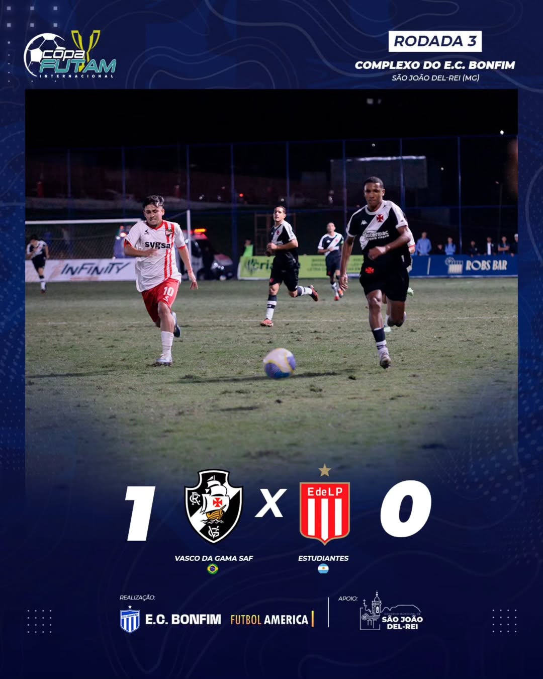 O Vasco venceu o Estudiantes-ARG, por 1 a 0, pela Copa Futam Internacional Sub-17, que está sendo realizada em São João del-Rei (MG). O gol foi de Rafinha (video). Com a vitória, o time lidera o grupo 1, com 7 pontos. Amanhã encara o GFI Academy-EUA.