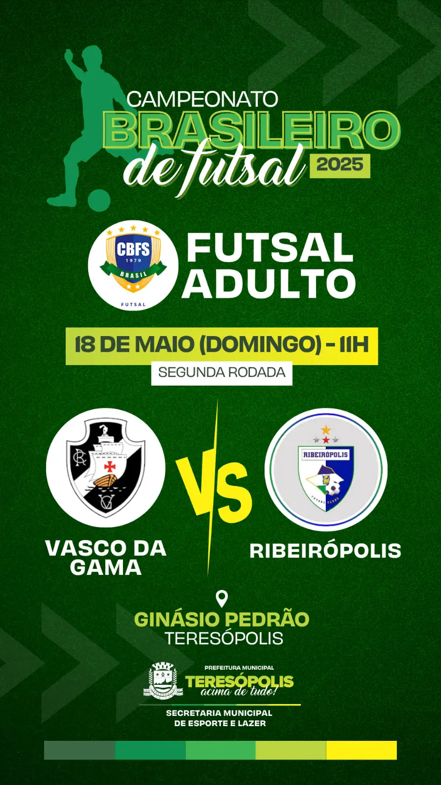 Vasco da Gama e Ribeirópolis se enfrentam neste domingo (18) e iniciam confronto pela segunda rodada do Campeonato Brasileiro de Futsal. A bola rola às 11h, no Ginásio Pedrão. Ambos os times buscam a primeira vitória na disputa para se colocar nas primeiras posições do grupo.