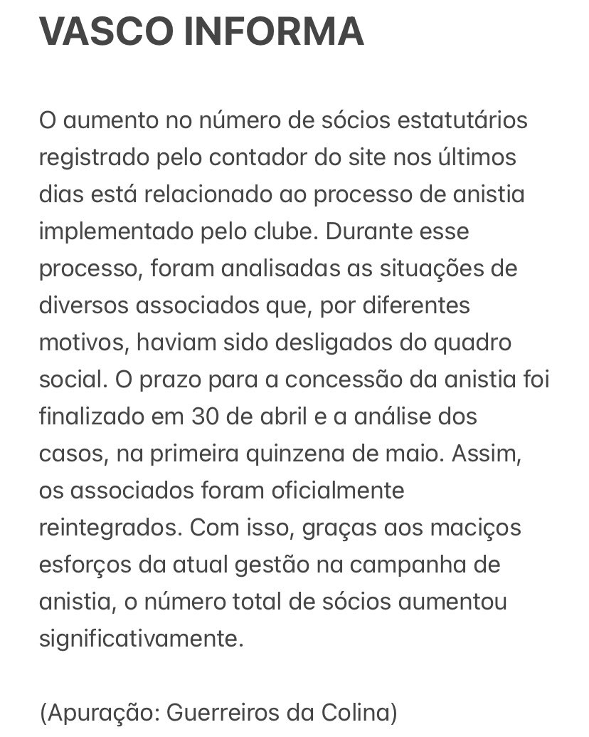 🚨 INFORMAÇÃO: Vasco esclarece aumento de sócios estatutários.
