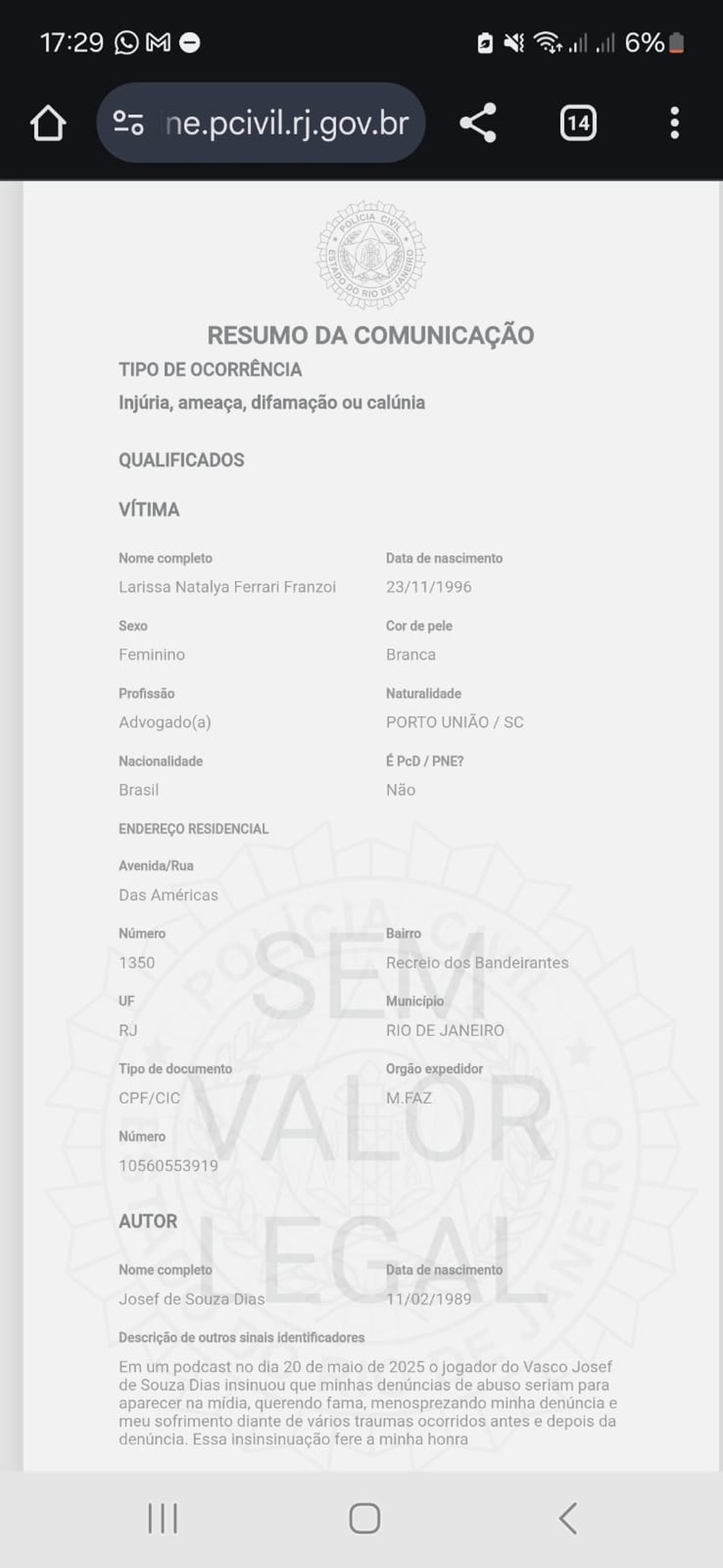O ex-volante Souza, que recentemente rescindiu contrato com o Vasco da Gama, tornou-se alvo de um boletim de ocorrência com pedido de representação criminal movido pela advogada Larissa Ferrari, que teve uma relação com o meia francês Dimitri Payet, do Vasco. A iniciativa legal foi motivada por declarações feitas por Souza durante participação no podcast Barbacast, transmitido nesta última terça-feira.