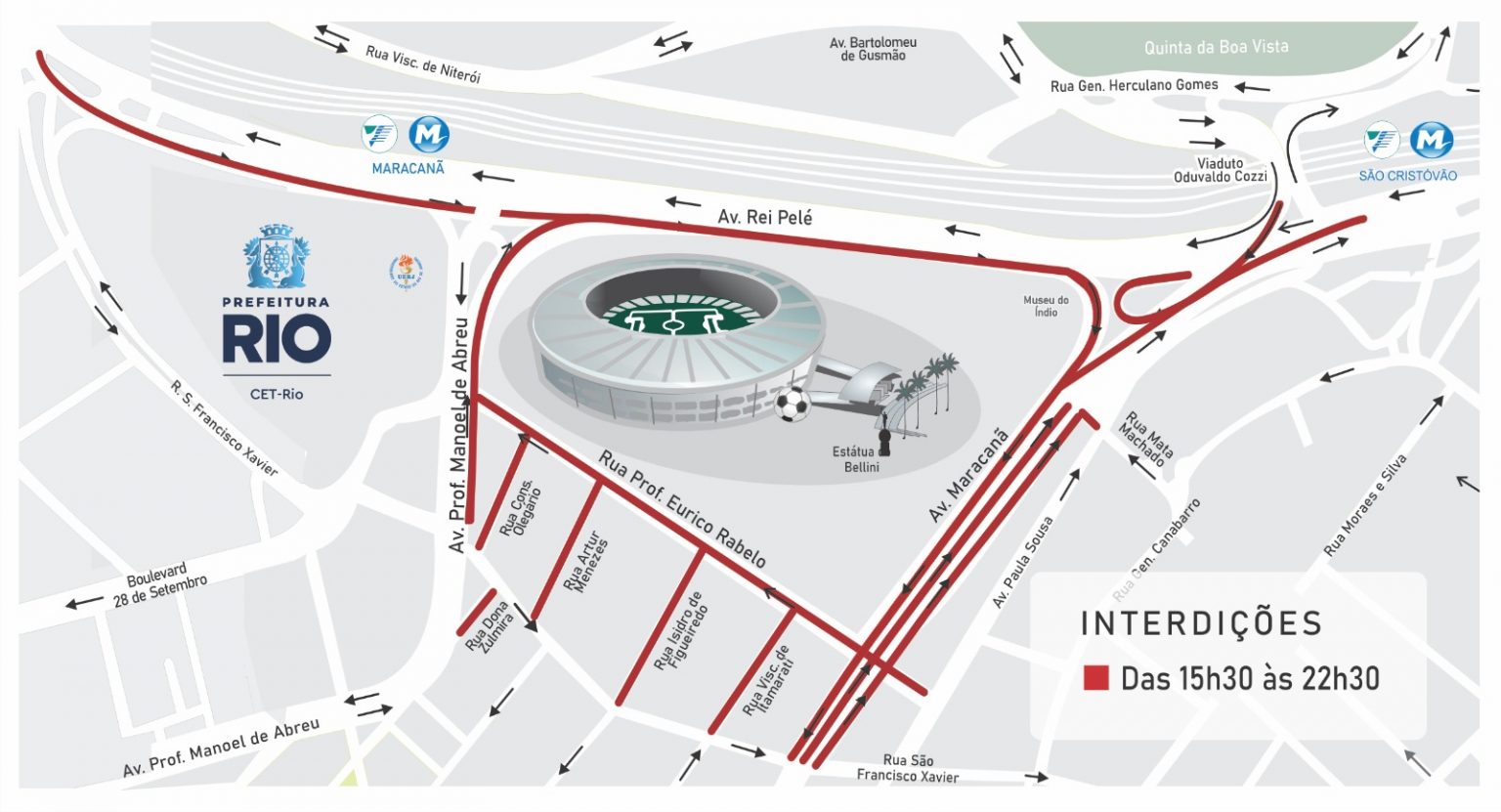 A CET-Rio realizará operação de trânsito neste sábado, 24/05, para o jogo entre Fluminense e Vasco pelo Campeonato Brasileiro, que acontecerá às 18h30, no estádio do Maracanã. A partir das 15h30, haverá interdições ao trânsito de veículos na região do estádio. E, além dos locais regulamentados com proibição de estacionamento, outras vias estarão restritas ao estacionamento a partir das 10h da data que ocorre a partida de futebol.