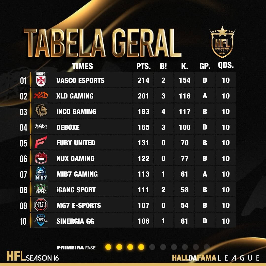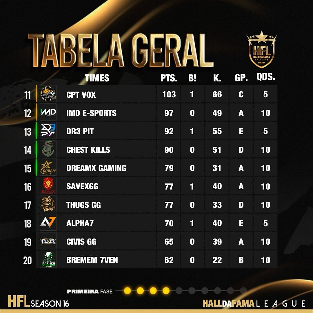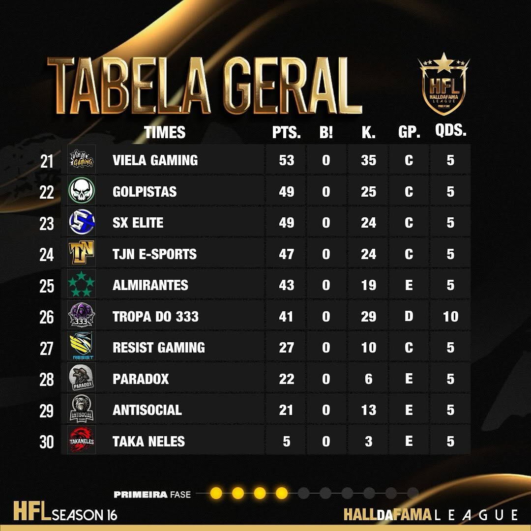 Tabela da RODADA 4 da FASE CLASSIFICATORIA da LIGA HFL SÉRIE A ELITE SEASON 16 🔥🚀