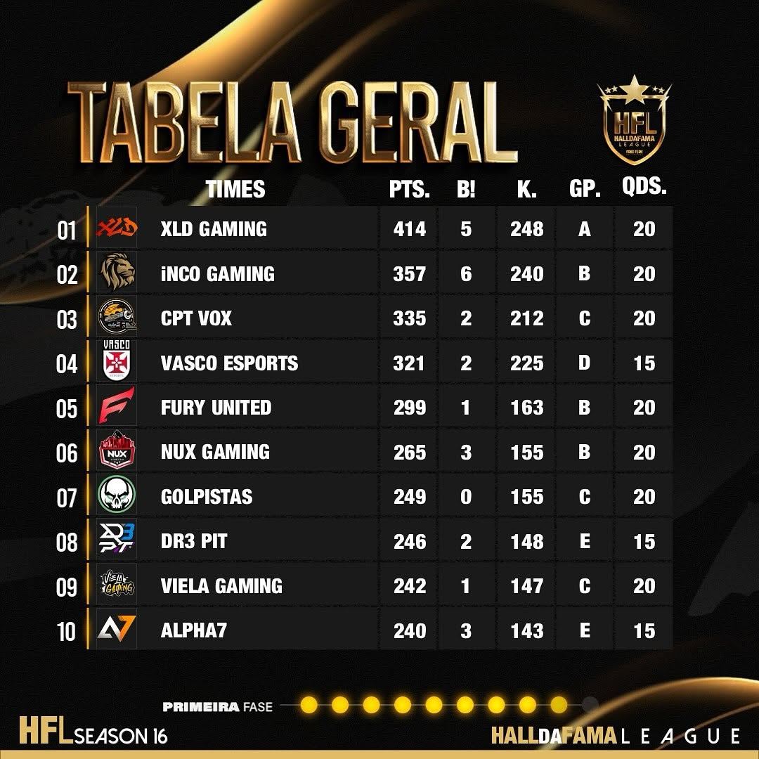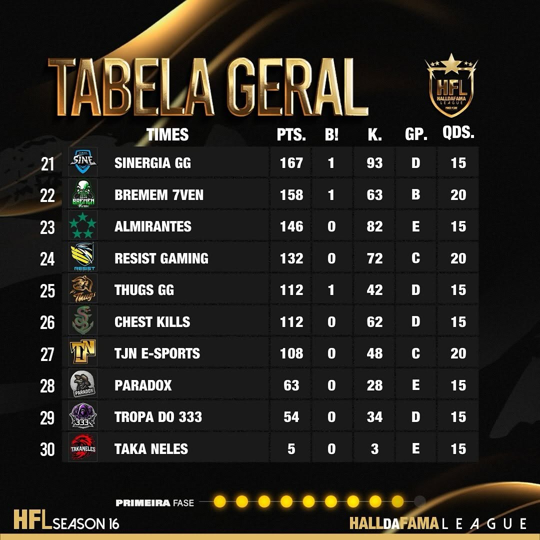 Tabela da RODADA 9 da FASE CLASSIFICATORIA da LIGA HFL SÉRIE A ELITE SEASON 16 🔥🚀
