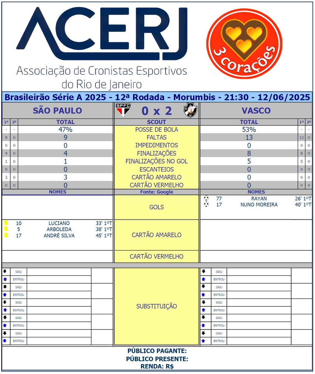 Scout do 1º Tempo de São Paulo e Vasco pela 12ª Rodada do Campeonato Brasileiro 2025 no Morumbis (Fonte: Google) #Acerjinforma #brasileirao2025 #SAOxVAS #SaoPauloFC #VascodaGama @Brasileirao @SaoPauloFC @VascodaGama