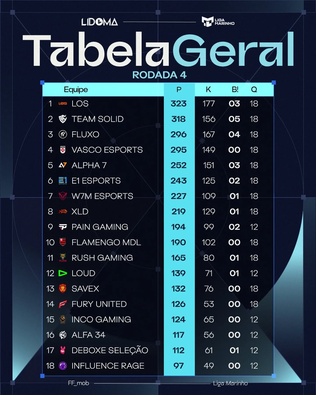 E aqui na linha marinho, quem se mantém na liderança é nada mais nada menos que a onda laranja! Em seguida fechando o topo da tabela, Team Solid e Fluxo seguem na busca da liderança geral!