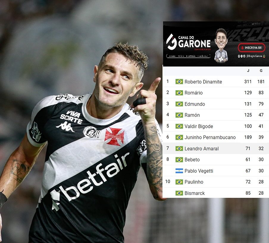 Vegetti igualou Bebeto no ranking histórico de artilheiros do Vasco na Serie A do Campeonato Brasileiro