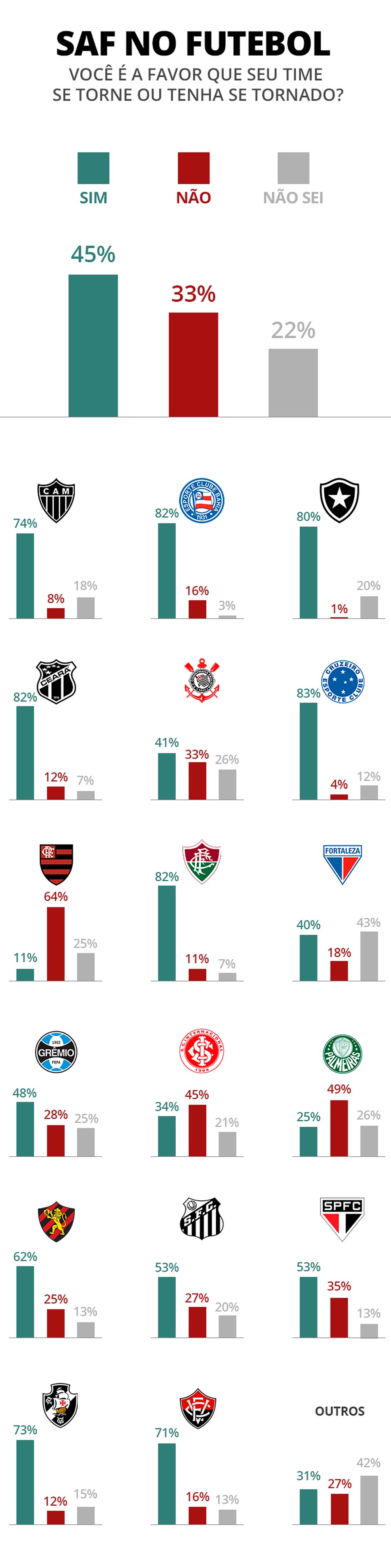 A maior rejeição às SAFs vem de torcedores do Flamengo e do Palmeiras, os dois maiores vencedores nos últimos anos do futebol brasileiro, ambos sob modelo associativo. Apenas 10,7% dos rubro-negros cariocas desejam que o clube se torne SAF – 64,3% disseram que não querem. Entre os palmeirenses, 25,1% disseram "sim" à hipótese de conversão para SAF, com 48,7% contrários.
