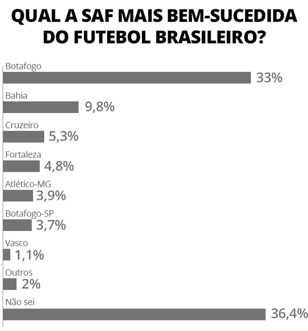 Atual campeã do Brasileiro e da Libertadores, a SAF do Botafogo foi considerada a mais bem-sucedida do futebol brasileiro para 33% dos entrevistados. Bem abaixo, estão as de Bahia (9,8%) e Cruzeiro (5,3%). Em briga judicial dentro e fora do país com antigo sócio na SAF, o Vasco aparece apenas com 1,1% dos votos entre as SAFs mais bem-sucedidas.