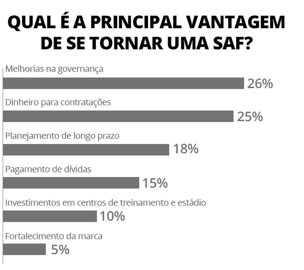O diretor do AtlasIntel destaca outros pontos da pesquisa. As "melhorias na governança" e o "dinheiro para contratações" andam lado a lado entre as principais vantagens para se tornar SAF, de acordo com mais da metade dos entrevistados.