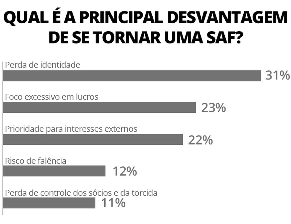 Quando perguntados sobre as desvantagens, 31,2% dos respondentes indicam a perda da identidade como principal fator – somados a 11,1% que escolheram como desvantagem a perda de controle dos sócios e torcida. Esses pontos indicam um perfil de torcida que se importa com as raízes do clube, mesmo sob problemas financeiros e de gestão.