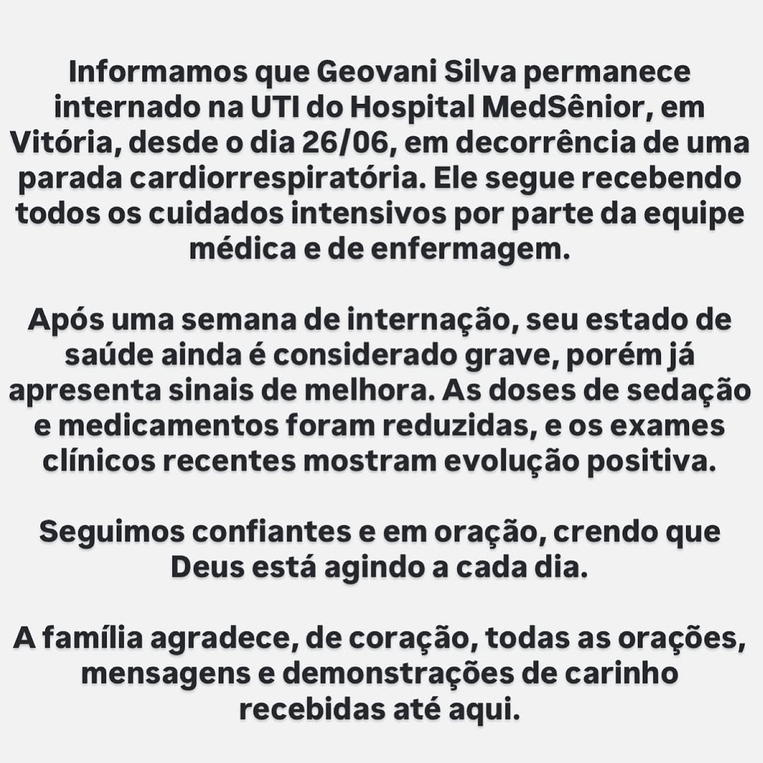 Informamos que Geovani Silva permanece internado na UTI do Hospital MedSênior, em Vitória, desde o dia 26/06, em decorrência de uma parada cardiorrespiratória. Ele segue recebendo todos os cuidados intensivos por parte da equipe médica e de enfermagem.