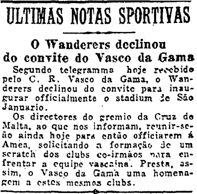 O Wanderers só visitaria São Januário em 31 de março de 1928, quando enfrentou o Vasco no amistoso que marcou a inauguração da arquibancada em curva e do sistema de iluminação do estádio. Esse jogo terminou com a vitória vascaína por 1 a 0, gol olímpico (o primeiro de que se tem notícia no Brasil) do ponta-esquerda Sant'Anna.