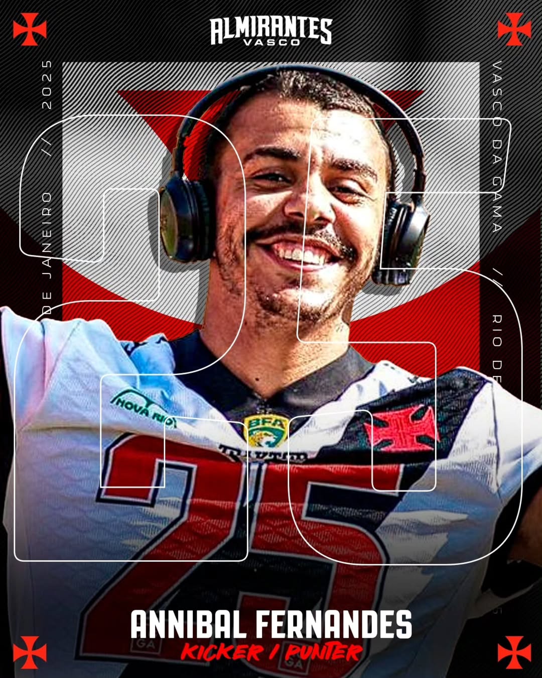 Annibal volta ao Vasco como kicker e punter para a temporada de 2025! O jogador que teve 100% de aproveitamento em Field Goal e XP em sua passagem em 2023, também já foi campeão carioca com o Vasco em 2019.