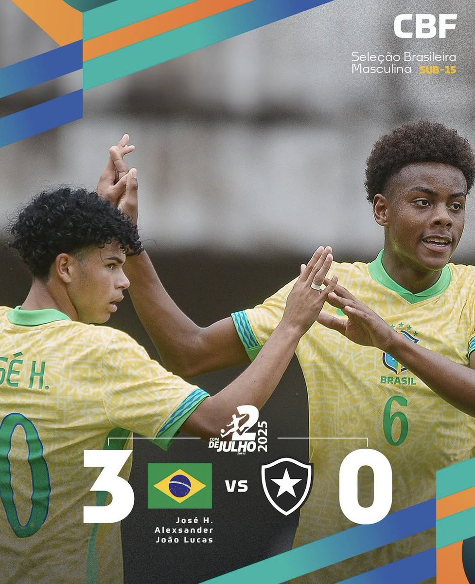 🖼️ Meus crias, Yuri Domingues e Rodrigo Jr., em ação pela Seleção Brasileira Sub-15 na vitória por 3 a 0 sobre o Botafogo, pela Copa 2 de Julho! 🇧🇷💢