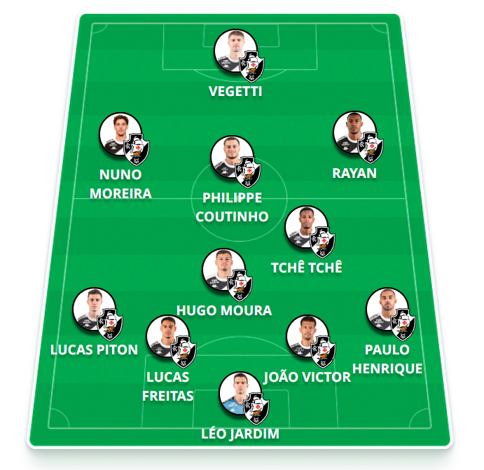 Escalação provável: Léo Jardim, Paulo Henrique, João Victor, Lucas Freitas (Mauricio Lemos), Lucas Piton; Hugo Moura, Tchê Tchê, Coutinho; Rayan, Vegetti e Nuno Moreira.