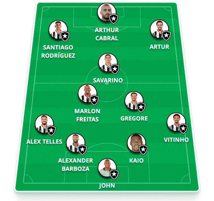 Escalação provável: John; Vitinho, Kaio, Barboza e Alex Telles; Gregore e Marlon Freitas; Artur, Savarino e Santi Rodríguez (Joaquín Correa ou Cuiabano); Arthur Cabral.