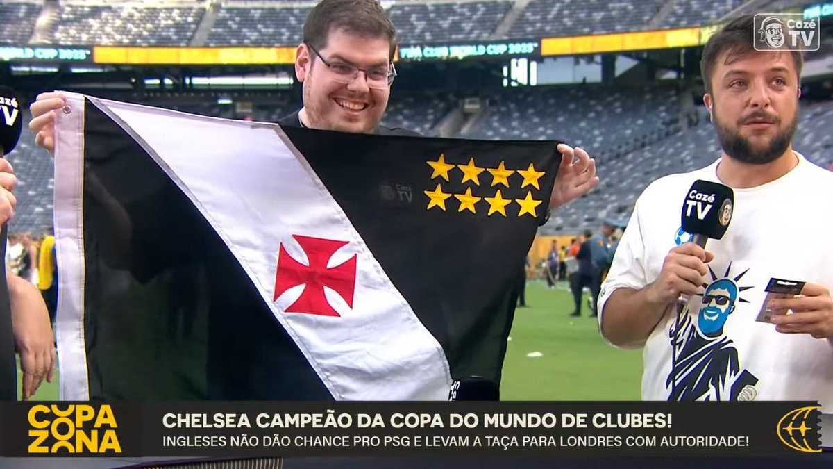 Dono da CazéTV, Casimiro Miguel exibe bandeira do Vasco no estádio que recebeu a final da Copa do Mundo de Clubes