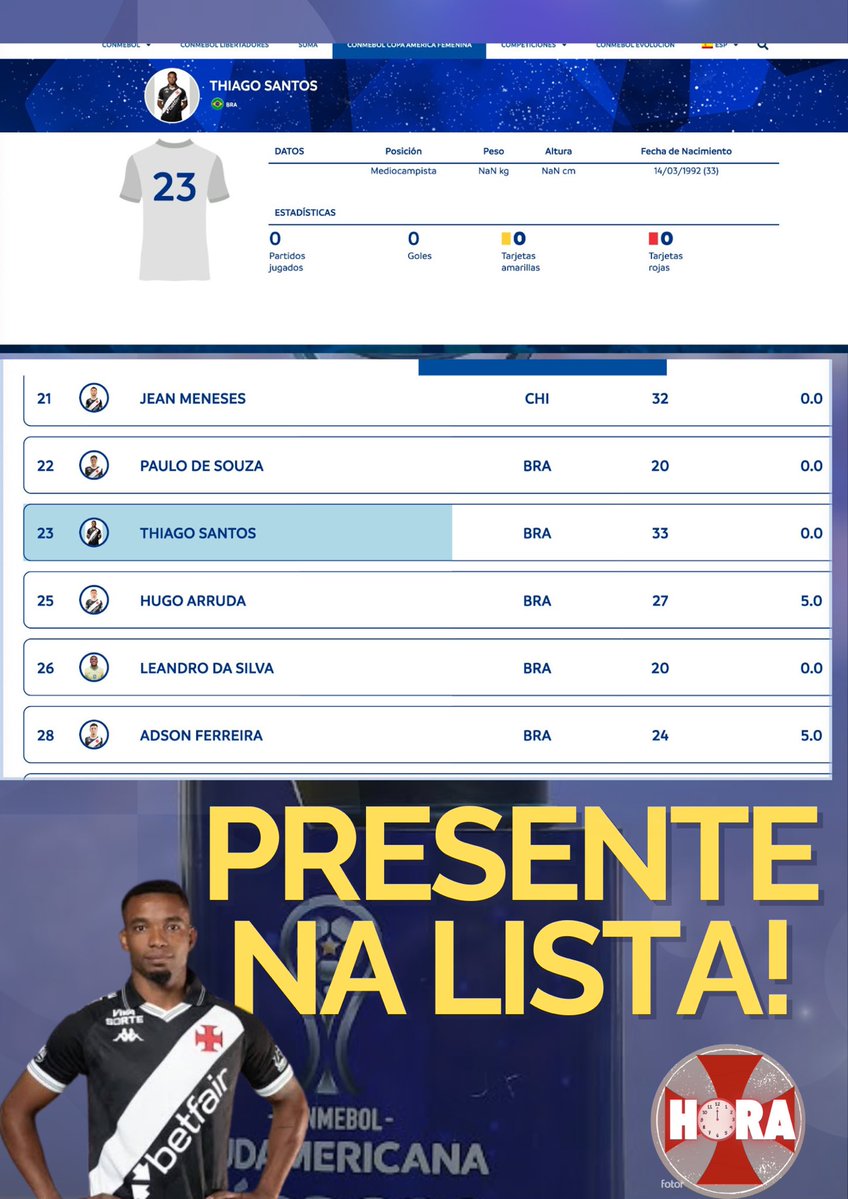 Thiago Mendes está entre os jogadores inscritos para a Copa Sul-Americana. O nome do atleta já aparece no site da Conmebol, como mostra a imagem.