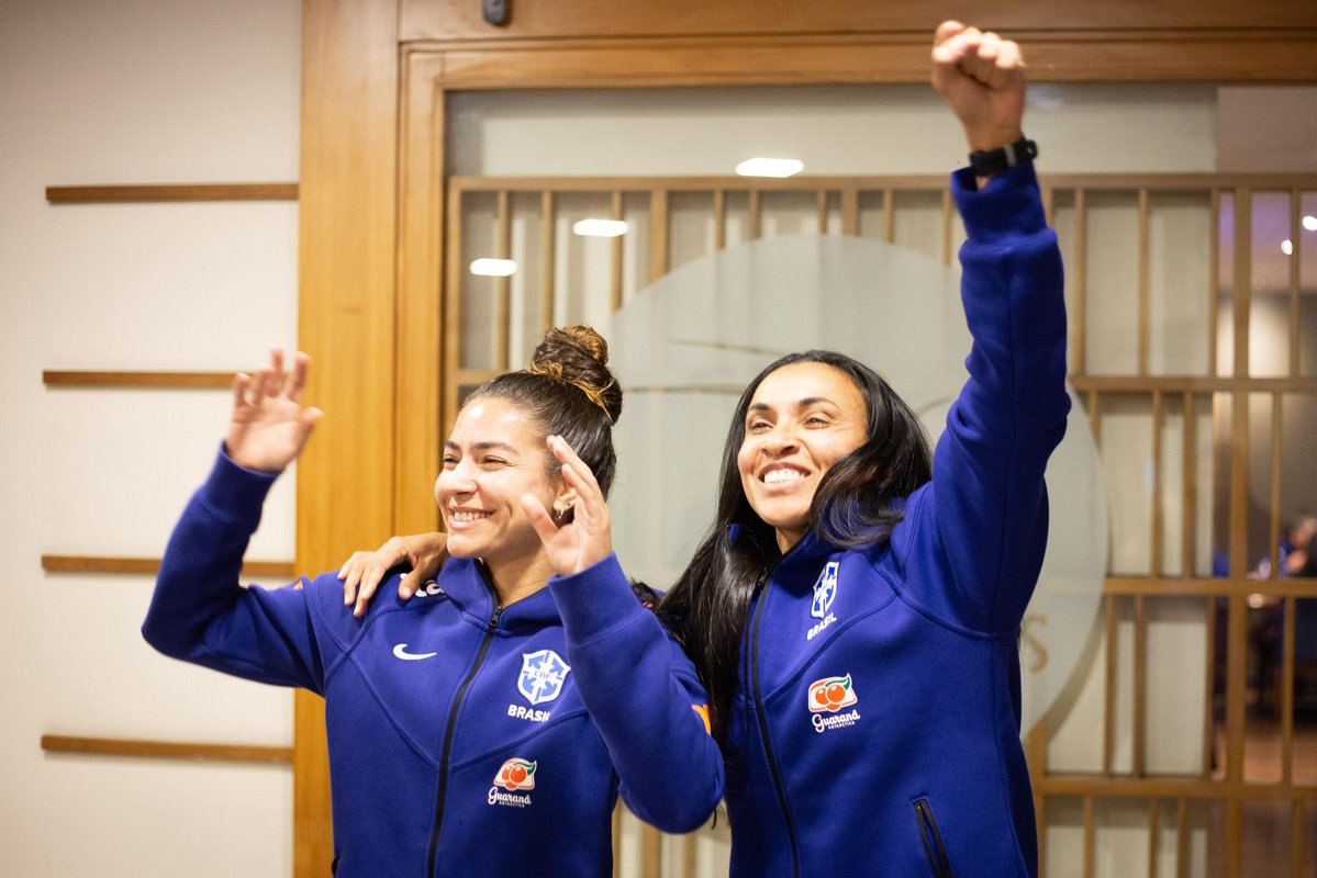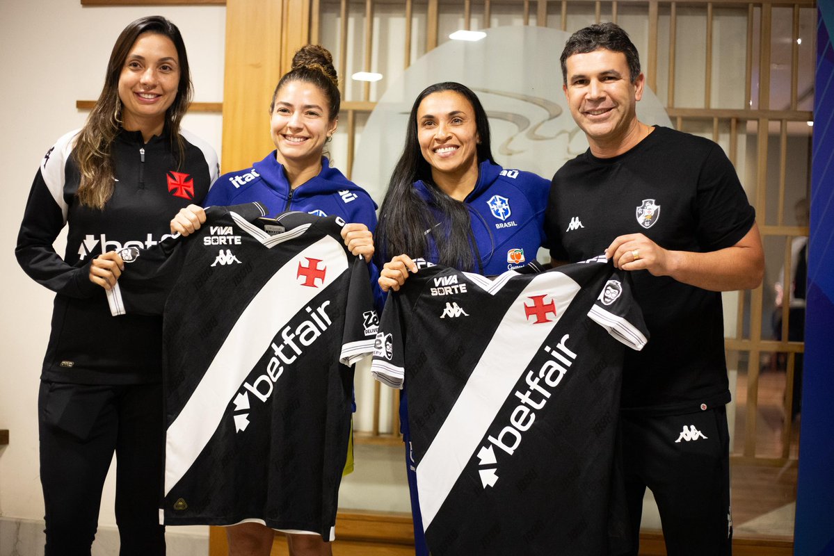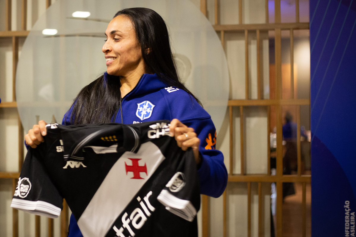 No mesmo hotel da Seleção Feminina em Quito, Vasco presenteia Marta e Angelina com camisas do clube