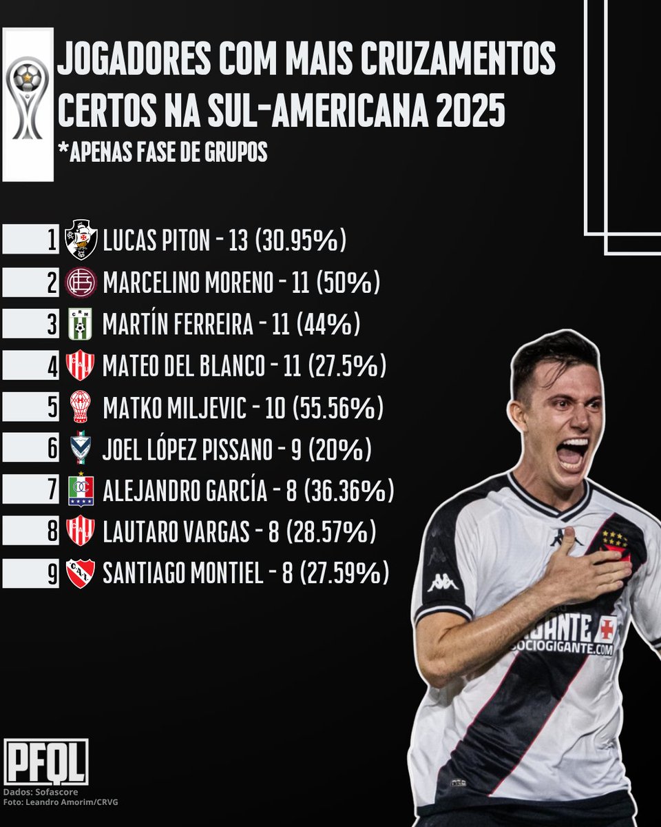 đź’˘ A Sul-Americana está de volta, com a fase de play-offs, e vamos a uma estatĂstica: Na fase de grupos do torneio, Lucas Piton, do Vasco, foi o jogador que mais acertou cruzamentos - 13, que corresponde a 30.95% do total de tentativas.