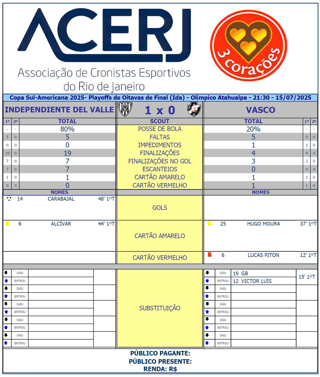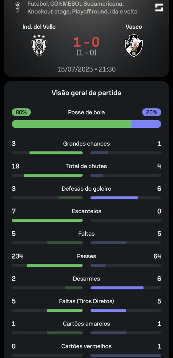 Scout do 1º Tempo de Independiente De Valle e Vasco pelo jogo de ida dos Playoffs de Oitavas de Final da Copa Sul-Americana 2025 no Olímpico Atahualpa (Fonte: Google) #Acerjinforma #Sudamericana #IDVxVAS #IDV #Vasco @Sudamericana @SudamericanaBR @IDV_EC @VascodaGama