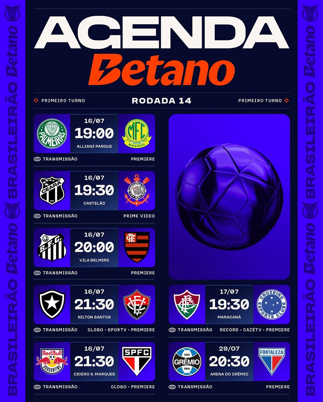 Se liga na agenda do Brasileirão para a 14ª rodada que começa hoje, 16! 🔥🔥