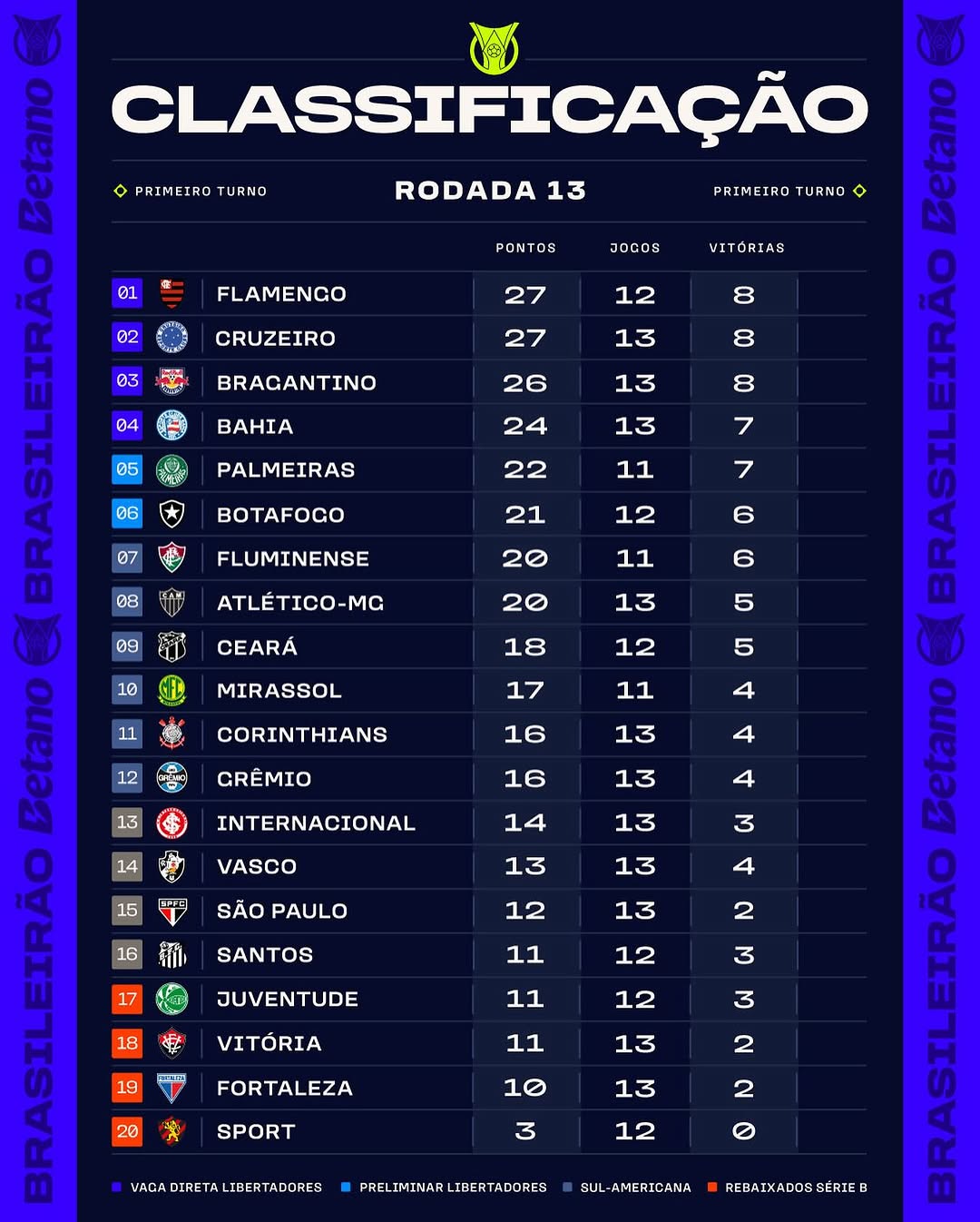 Se liga na tabela atualizada depois dos jogos dessa 13ª rodada do Brasileirão! Me diz ai, seu time tá em qual posição? 🔥