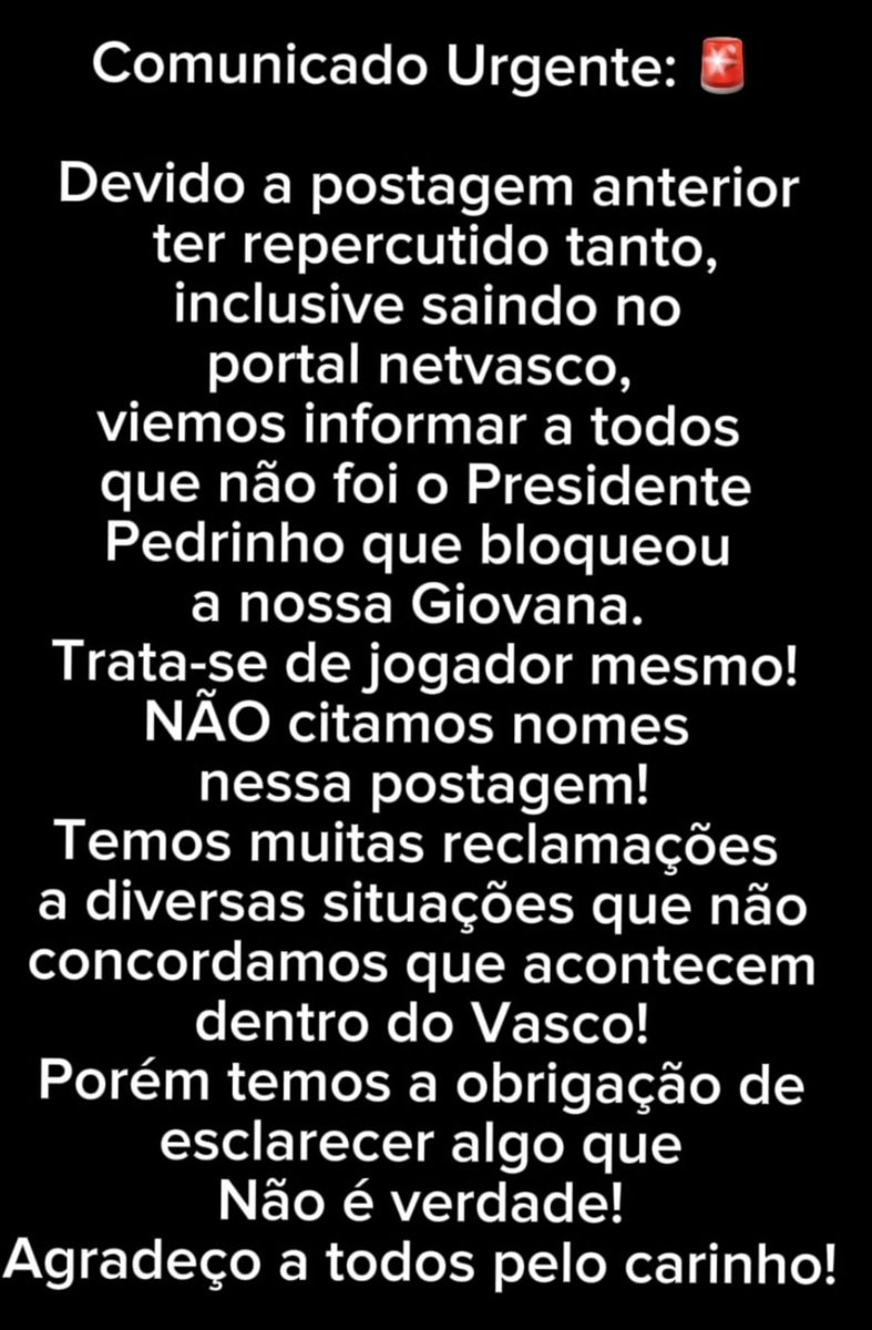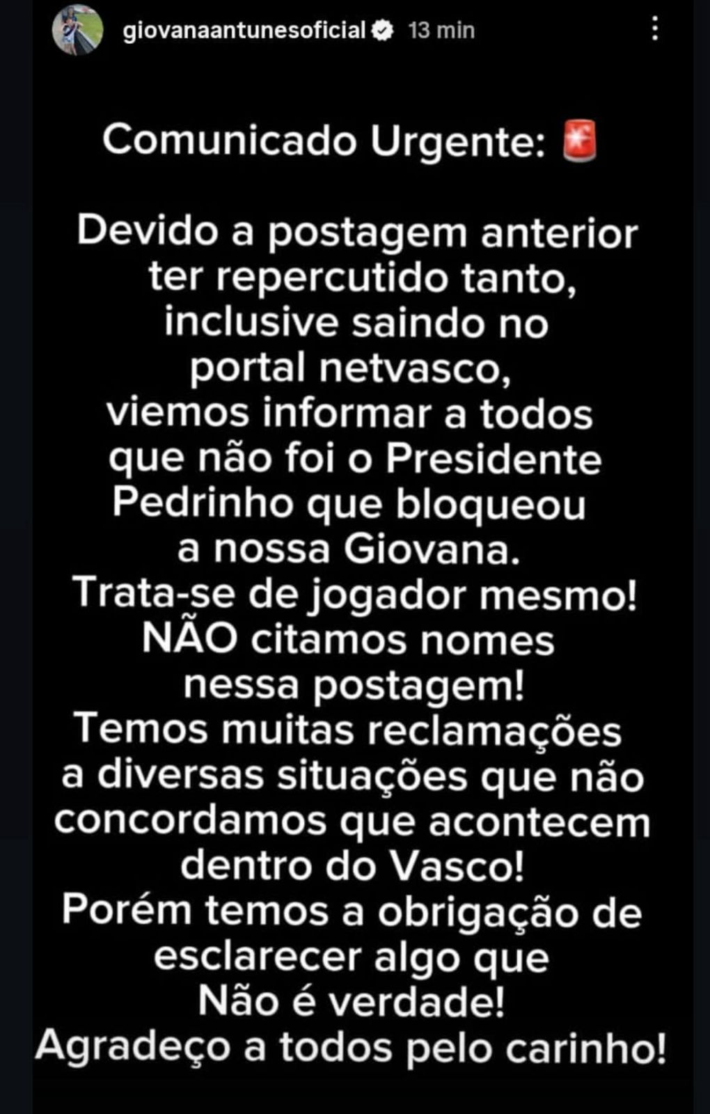 Por meio de seu Instagram, a jovem influenciadora Giovana Antunes se posicionou sobre o vídeo que publicou ontem, em sua rede social, em que afirmava ter sido bloqueada por um ídolo do Vasco.