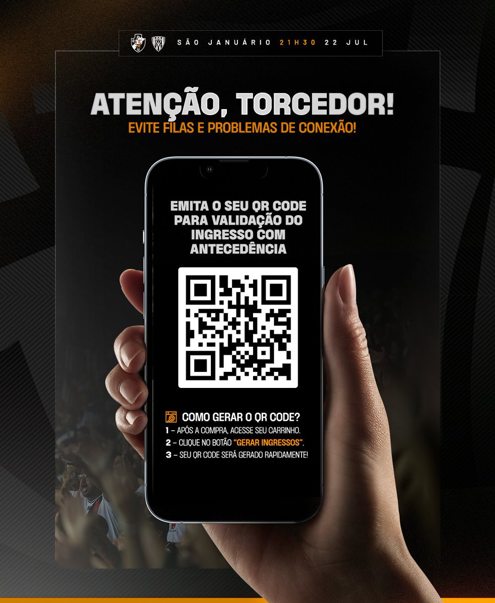 Vasco pede aos torcedores que emitam o QR Code de seus ingressos para o jogo desta 3ª-feira