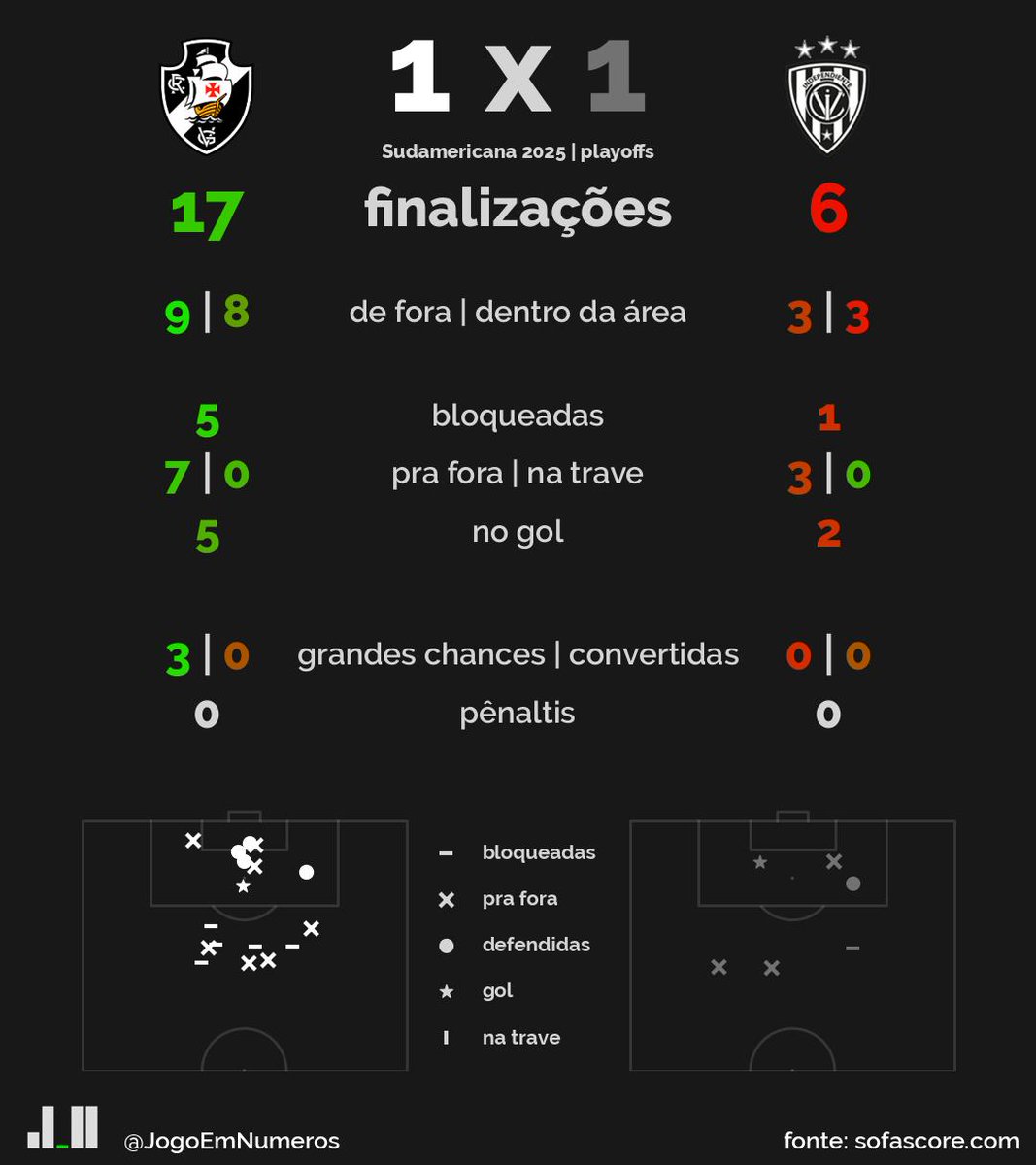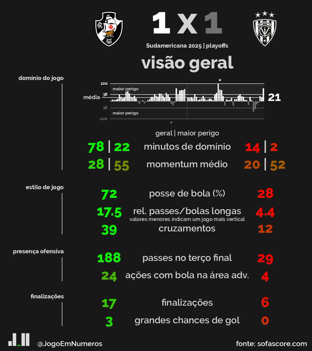 O Vasco fez um jogo de posse de bola e teve uma alta presença ofensiva, enquanto o Ind. del Valle foi vertical e pouco presente no ataque. O Cruzmaltino finalizou muito mais, 17 x 6, e criou 3 grandes chances de gol (nenhuma convertida). Apesar da superioridade, o Vasco fez o necessário e apenas empatou.