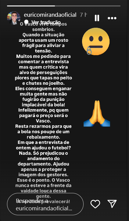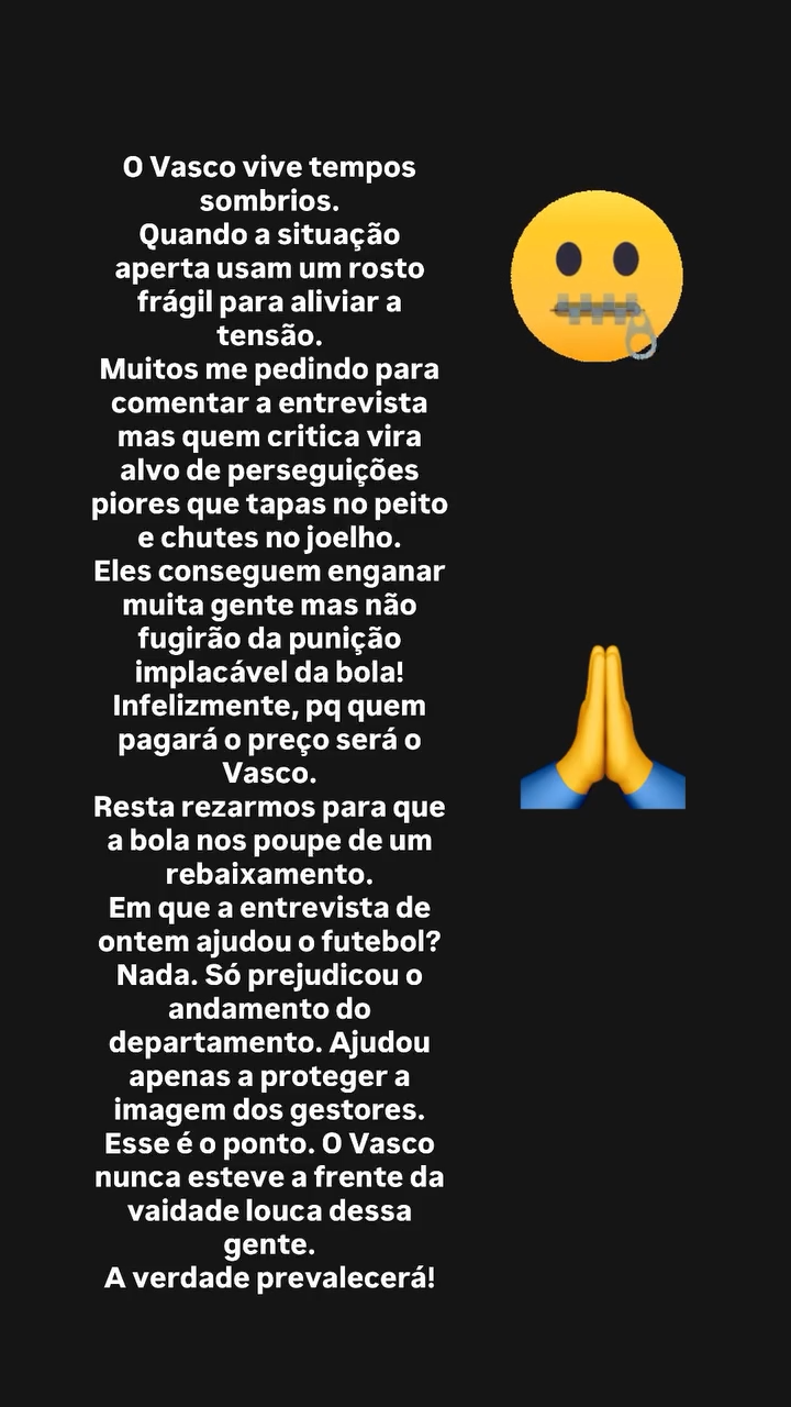 "O Vasco vive tempos sombrios. Quando a situação aperta, usam um rosto frágil para aliviar a tensão. Muitos me pedindo para comentar a entrevista, mas quem critica vira alvo de perseguições piores que tapas no peito e chutes no joelho. Eles conseguem enganar muita gente, mas não fugirão da punição implacável da bola! Infelizmente, porque quem pagará o preço será o Vasco", disse em story publicado no Instagram.