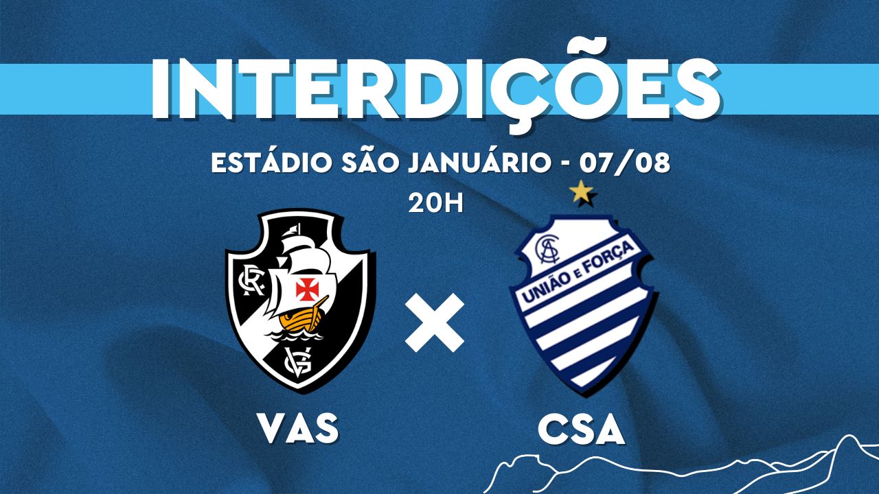 O Centro de Operações e Resiliência da Prefeitura do Rio (COR-Rio) informa que uma operação de trânsito especial foi organizada pela CET-Rio para o jogo entre Vasco da Gama e CSA, pelas oitavas de final da Copa do Brasil. O jogo está programado para às 20h desta quinta-feira (07/08), no estádio São Januário. A partir de 13h, haverá interdições ao trânsito de veículos na região.