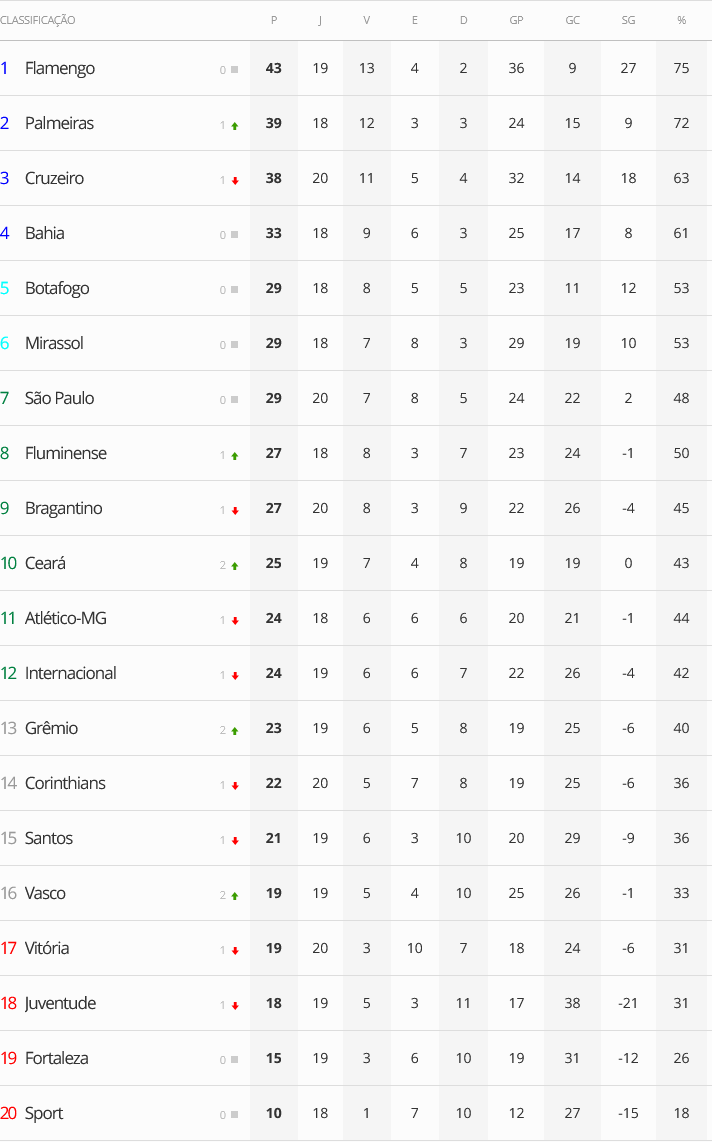 Terminado o jogo atrasado da 14ª rodada do Campeonato Brasileiro, o Vasco, que perdeu para o Juventude por 2 a 0, continuou na 16ª colocação e tem o mesmo número de pontos do 1º time na zona de rebaixamento. O time de Caxias do Sul está a 1 ponto do Vasco.