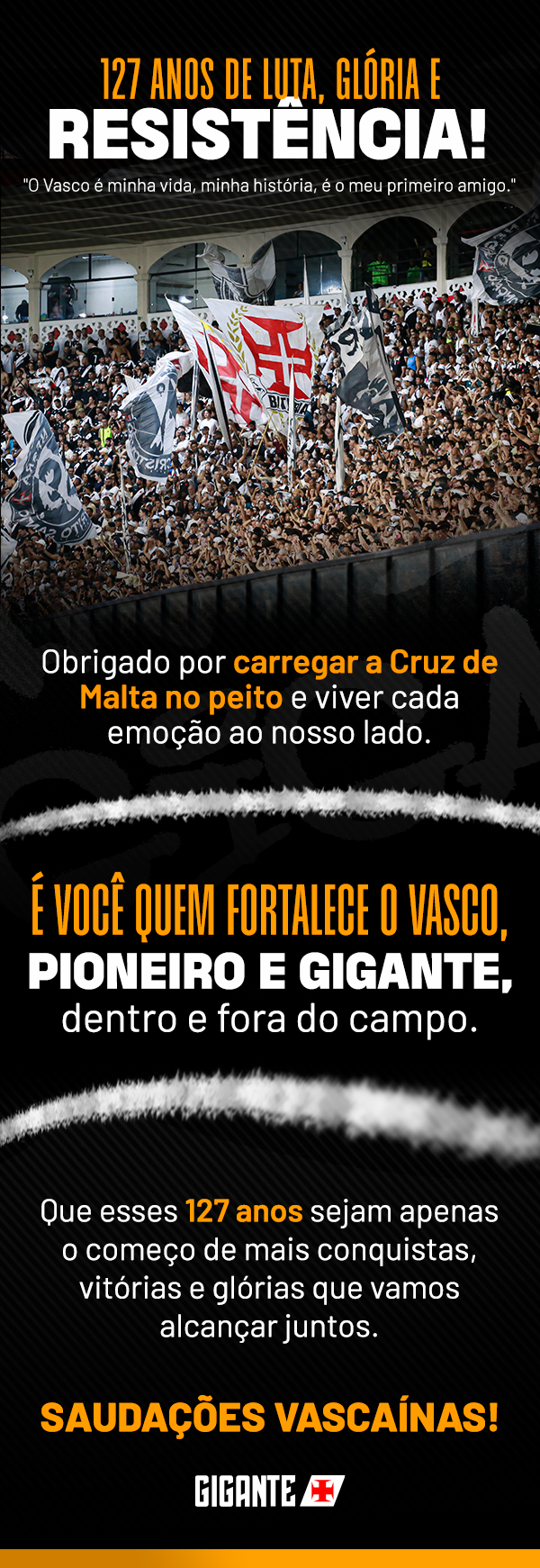 Vasco manda mensagem aos sócios em comemoração aos 127 anos; confira