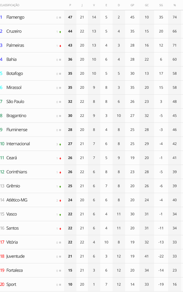 Terminada a 22ª rodada do Campeonato Brasileiro, o Vasco, que venceu o Sport por 3 a 2, subiu da 16ª para a 15ª colocação.