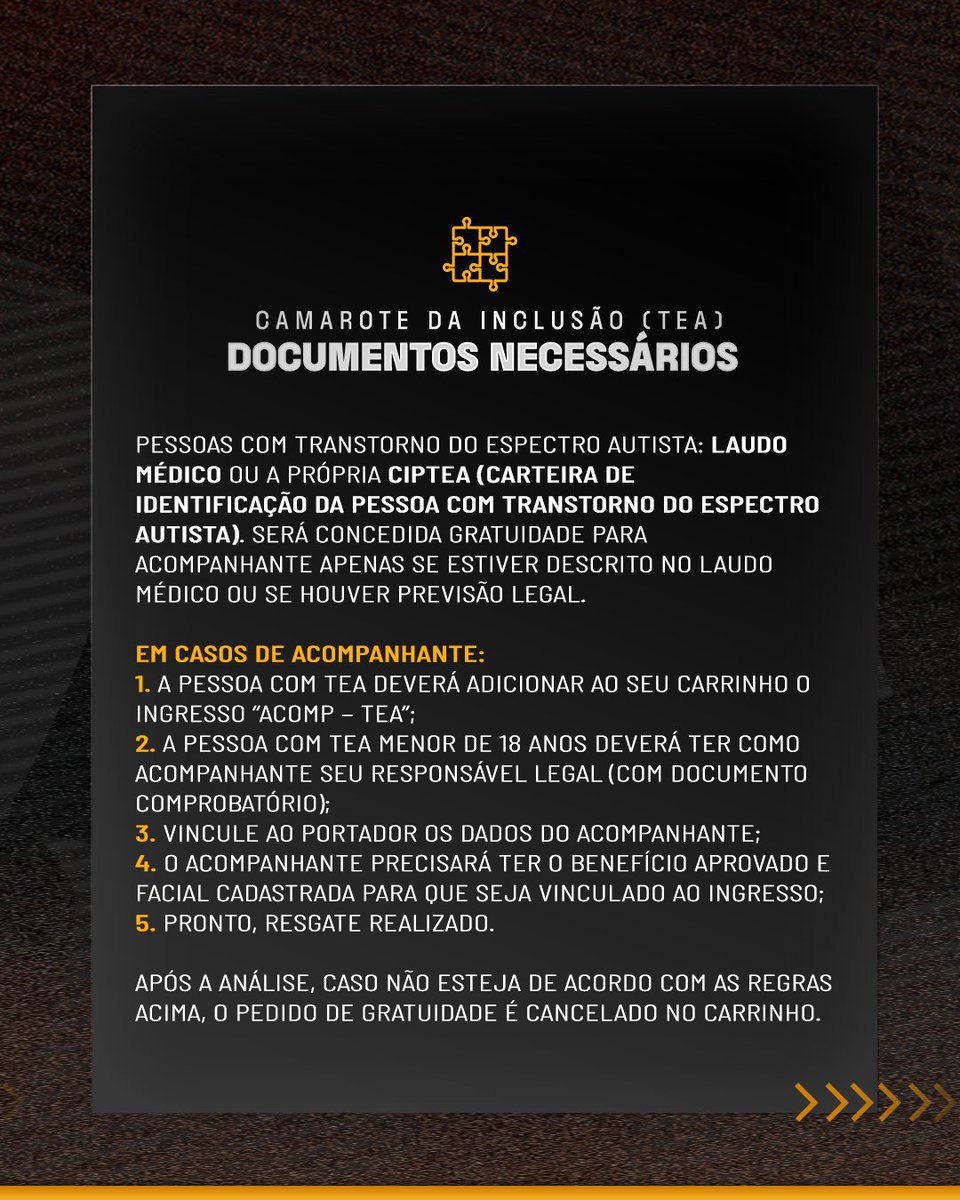 A partir da próxima partida em casa, diante do Ceará (14/09), será possível fazer o resgate de gratuidade PCD para torcedores com Transtorno do Espectro Autista (TEA).