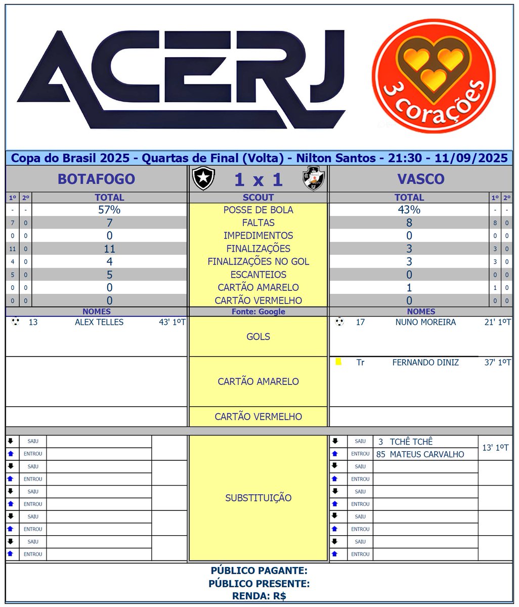 Scout do 1º Tempo de Botafogo e Vasco pelo jogo de volta das Quartas de Final da Copa do Brasil 2025 no Nilton Santos (Fonte: Google) #Acerjinforma #CopaBetanoDoBrasil #BOTxVAS #Botafogo #Vasco @CopaDoBrasilCBF @Botafogo @VascodaGama