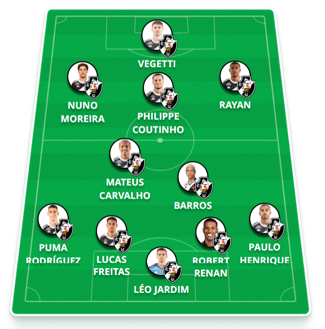 A provável escalação do Vasco: Léo Jardim; Paulo Henrique, Robert Renan, Lucas Freitas, Puma Rodríguez; Barros, Mateus Carvalho, Coutinho; Nuno Moreira, Rayan e Vegetti.