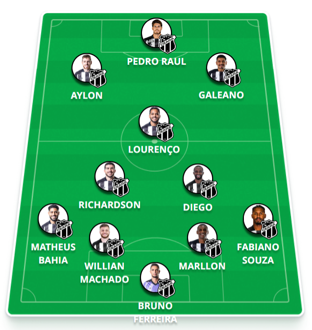 A provável escalação do Ceará: Bruno Ferreira, Fabiano Souza, Marllon, William Machado e Matheus Bahia; Dieguinho, Richardson e Lourenço; Galeano, Aylon e Pedro Raul.