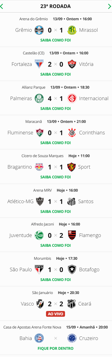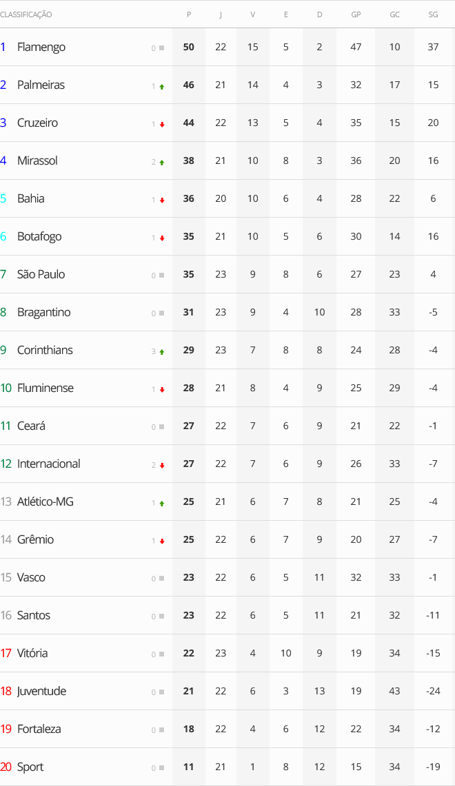 Terminados os jogos deste domingo da 23ª rodada do Campeonato Brasileiro, o Vasco, que empatou com o Ceará por 2 a 2, segue na 15ª colocação.
