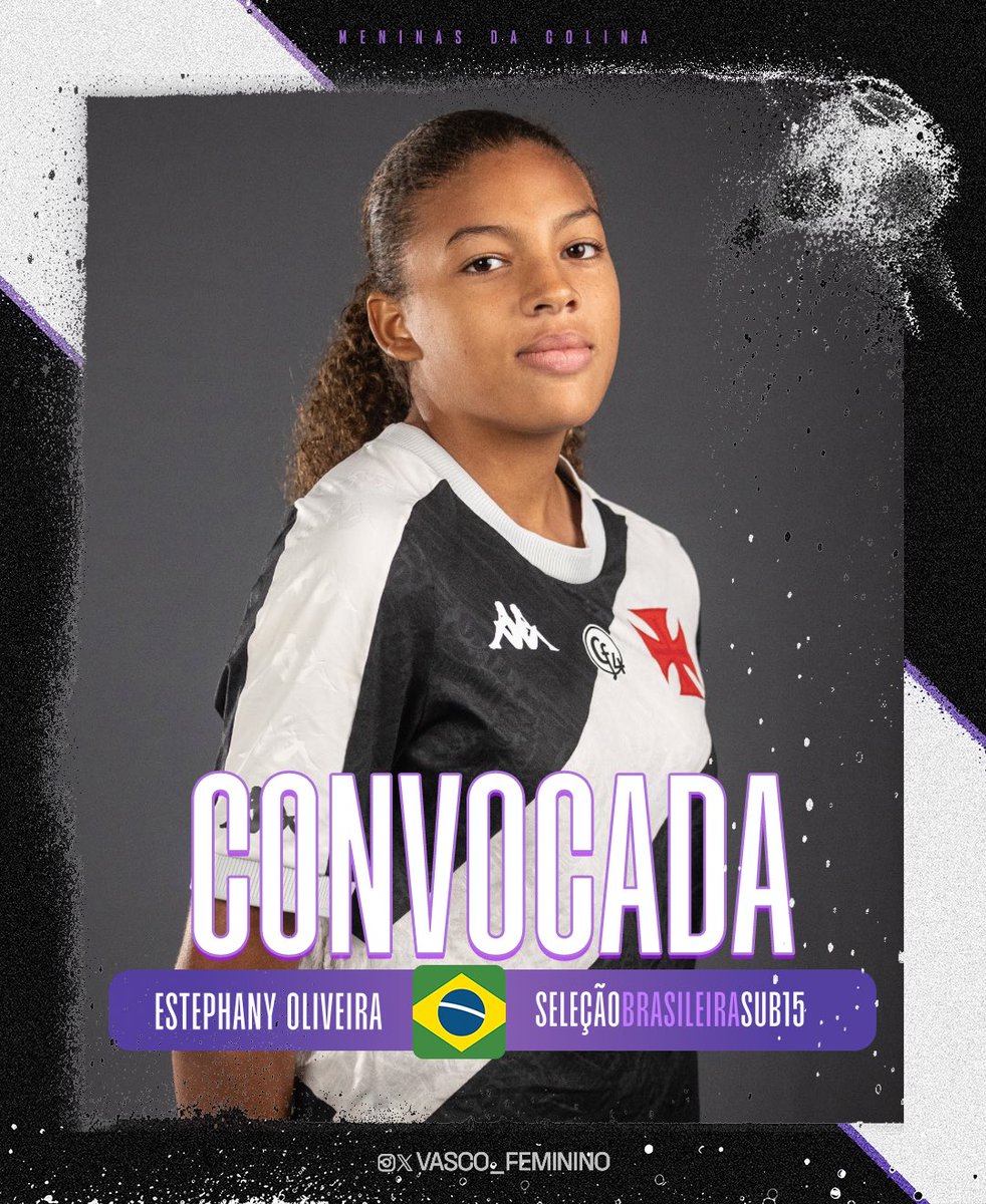 O Vasco da Gama tem mais uma representante no cenário internacional. A atacante Estephany, Cria da Colina, foi convocada para defender a Seleção Brasileira Sub-15 na disputa da Conmebol Liga Evolución, que acontecerá entre os dias 24 de setembro e 5 de outubro, em Ypané, no Paraguai.
