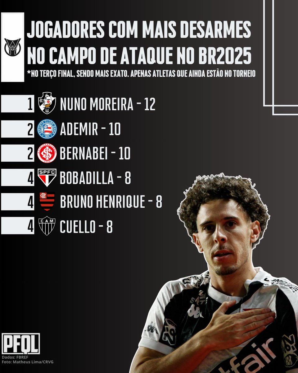 💢 Há um seleto grupo de jogadores com, pelo menos, 8 desarmes no campo de ataque (sendo específico, no terço final) no Brasileirão 2025. Entre eles, o líder é Nuno Moreira, do Vasco, que conseguiu 12 desarmes nesse setor até aqui. Se quer fazer pressão, é com eles que se deve conversar!
