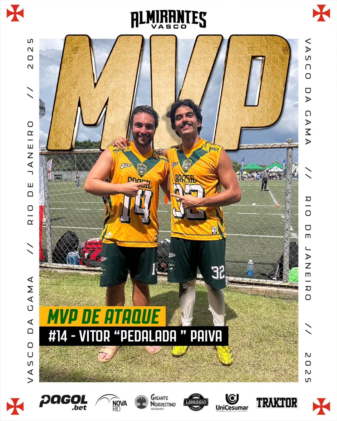 No masculino, o destaque ficou para o nosso quarterback Vitor "Pedalada" Paiva (#14), eleito MVP de Ataque. Um reconhecimento gigante para quem conduz com maestria dentro de campo. 🔥