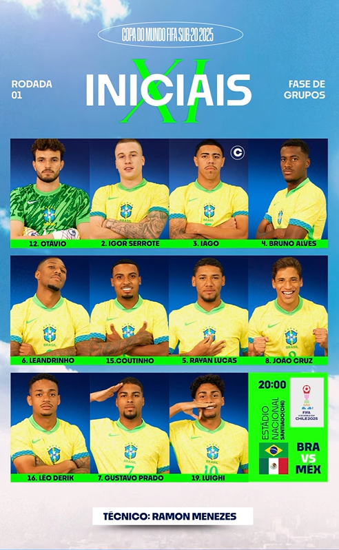 O lateral-esquerdo Leandrinho será titular da Seleção Brasileira na estreia do Mundial Sub-20, às 20h (horário de Brasilia), contra o México. A competição está sendo realizada no Chile. Confira: