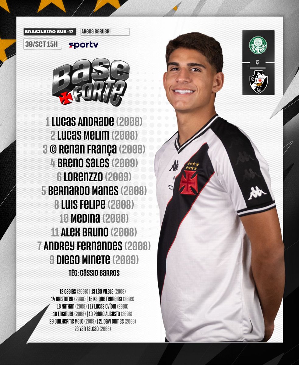 Sub-17: Confira a escalação do Vasco para o jogo contra o Palmeiras