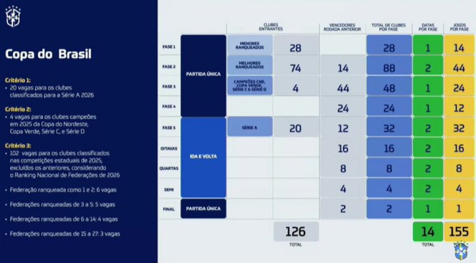 Somando todas as fases, 126 clubes vão disputar a competição. Em 2027, este número aumentará para 128. Até 2025, o principal torneio mata-mata do país começava com 92 times.
