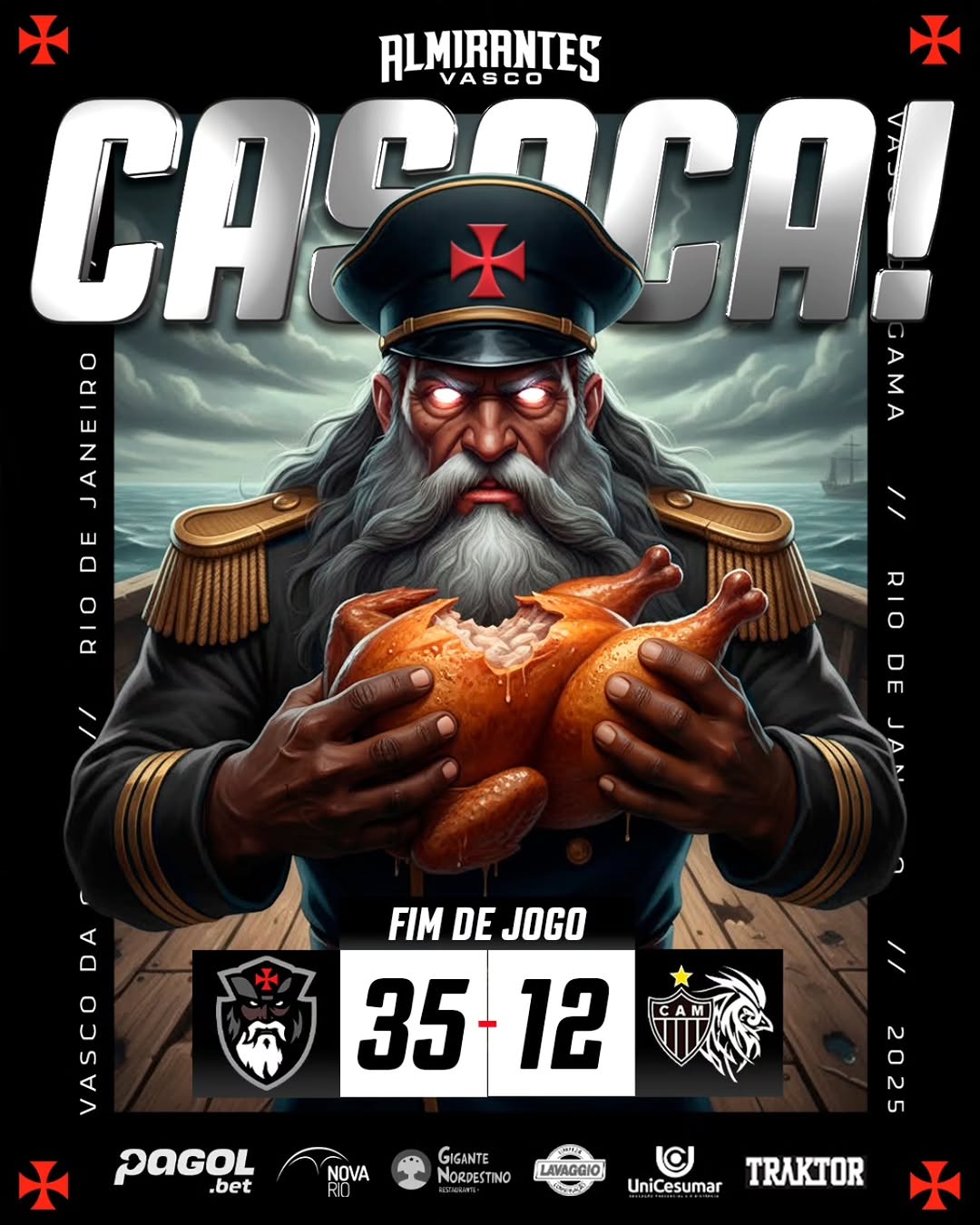 O Vasco Almirantes impõem um jogo dominante contra o Galo FA e vence a partida pelo placar de 35 a 12. Essa é a primeira vitória do Vasco sobre o Galo, vitória decisiva para continuar sua trajetória no campeonato!