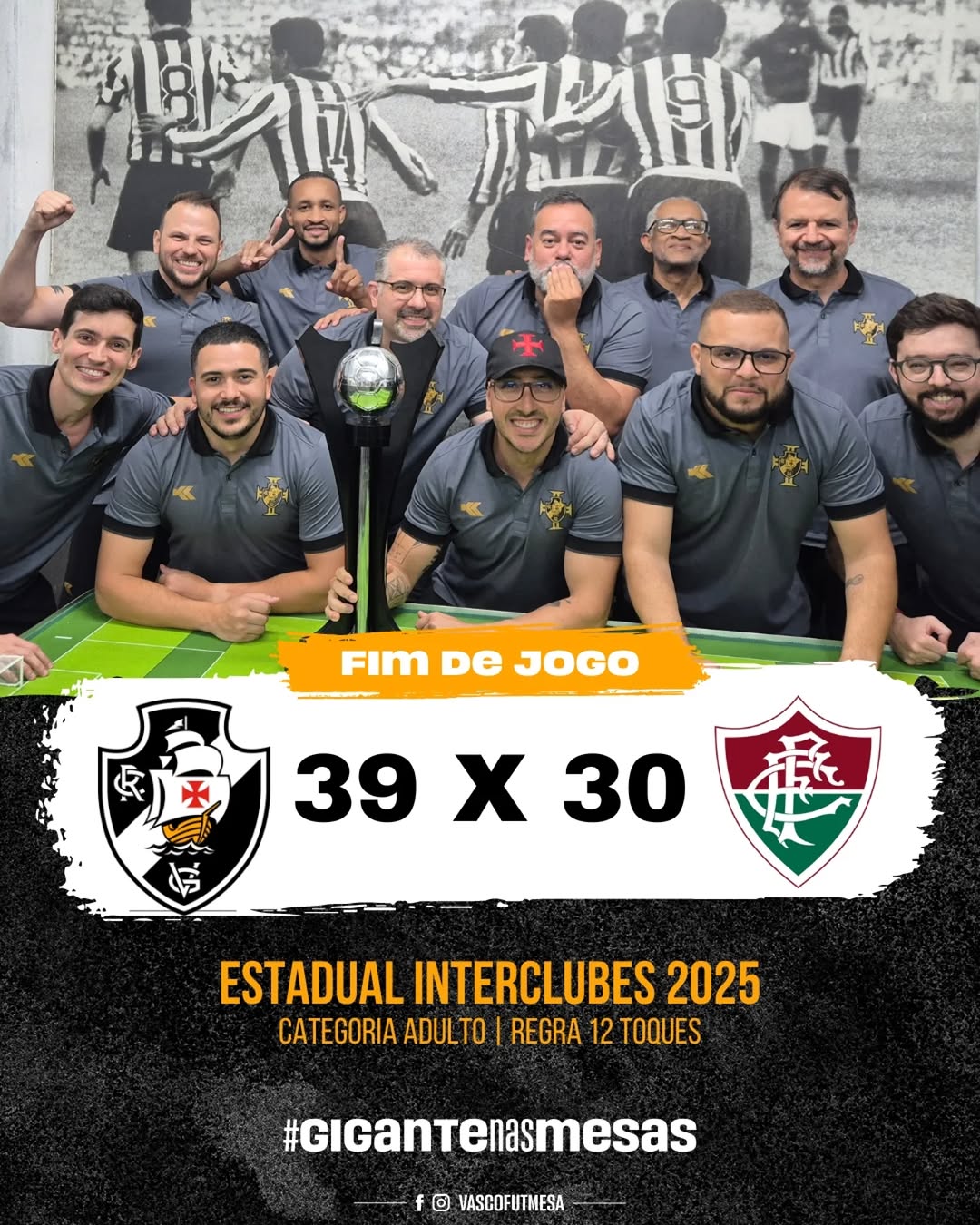 O Vasco Futmesa confirmou, neste sábado, 4 de outubro, sua hegemonia no futebol de mesa carioca ao conquistar a Taça Rio, o segundo turno do Campeonato Estadual Interclubes – categoria Adulto (Regra 12 Toques). Com o título, o Gigante da Colina assegurou o tetracampeonato consecutivo (2022, 2023, 2024 e 2025) e o 12º título estadual de sua gloriosa história na modalidade.